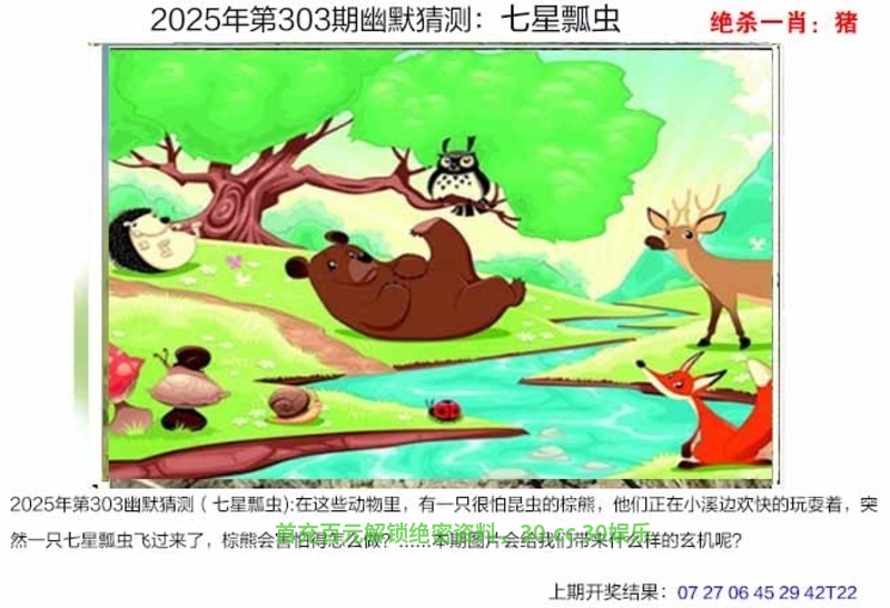 303期图片猜测(七星瓢虫)【开:兔15】 在这些动物里,有一只很怕昆虫的棕熊,他们正在小溪边欢快的玩耍着,突然一只七星瓢虫飞过来了,棕熊会害怕得怎么做?......本期图片会给我们带来什么样的玄机呢? 解:七星瓢虫解阳肖兔虎牛鸡猴羊幽默猜测推荐六肖:羊虎兔猴牛鸡本期猜测看好十码:11.35.16.28.15.39.10.22.05.33点击注册30.cc娱乐城3090.com大额无忧 |